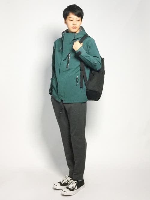 深緑のマウンテンパーカー 無地 のメンズコーディネート 着こなし